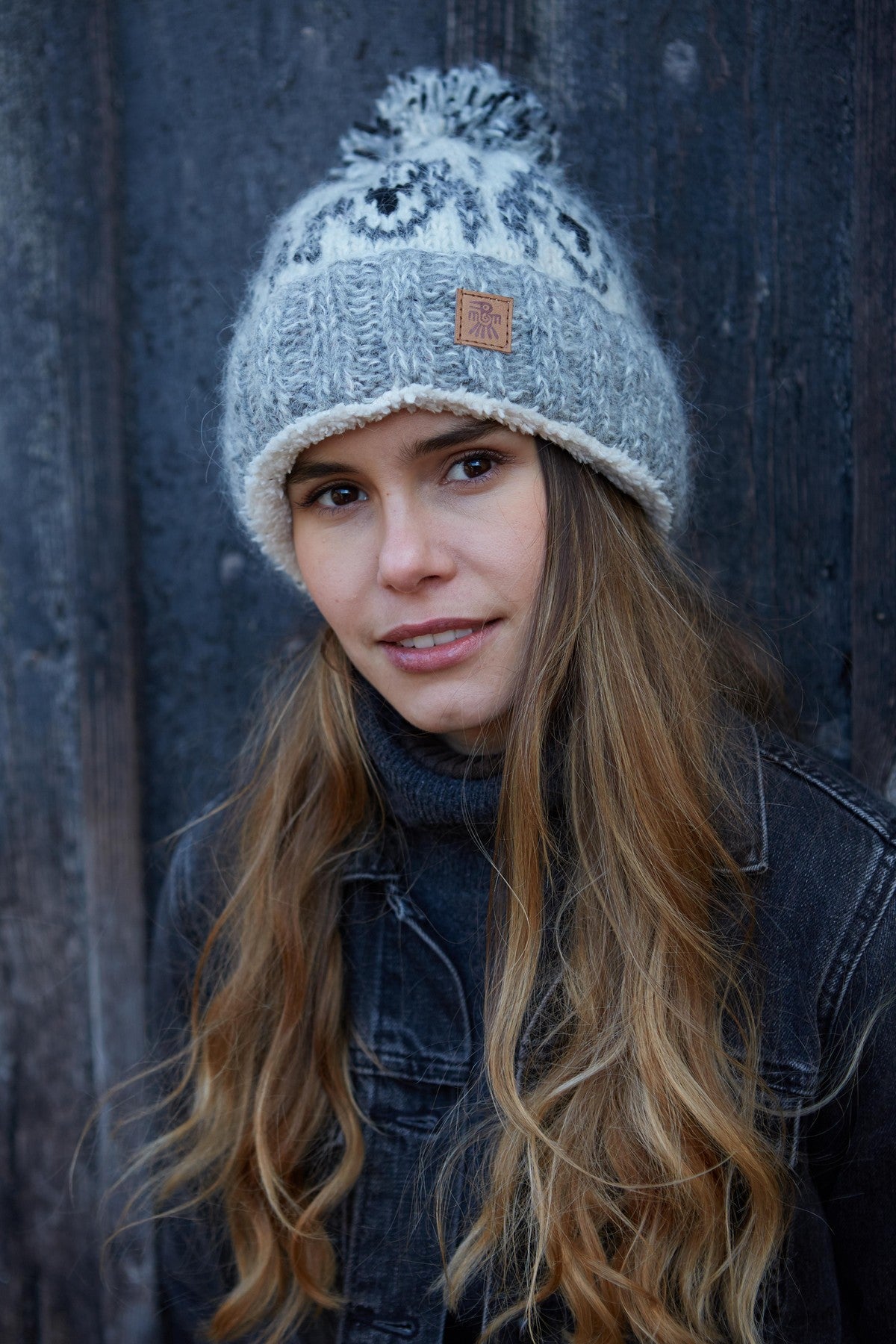 Super soft wool and mohair blend. Sherpa fleece lined around forehead. Fair trade sourced