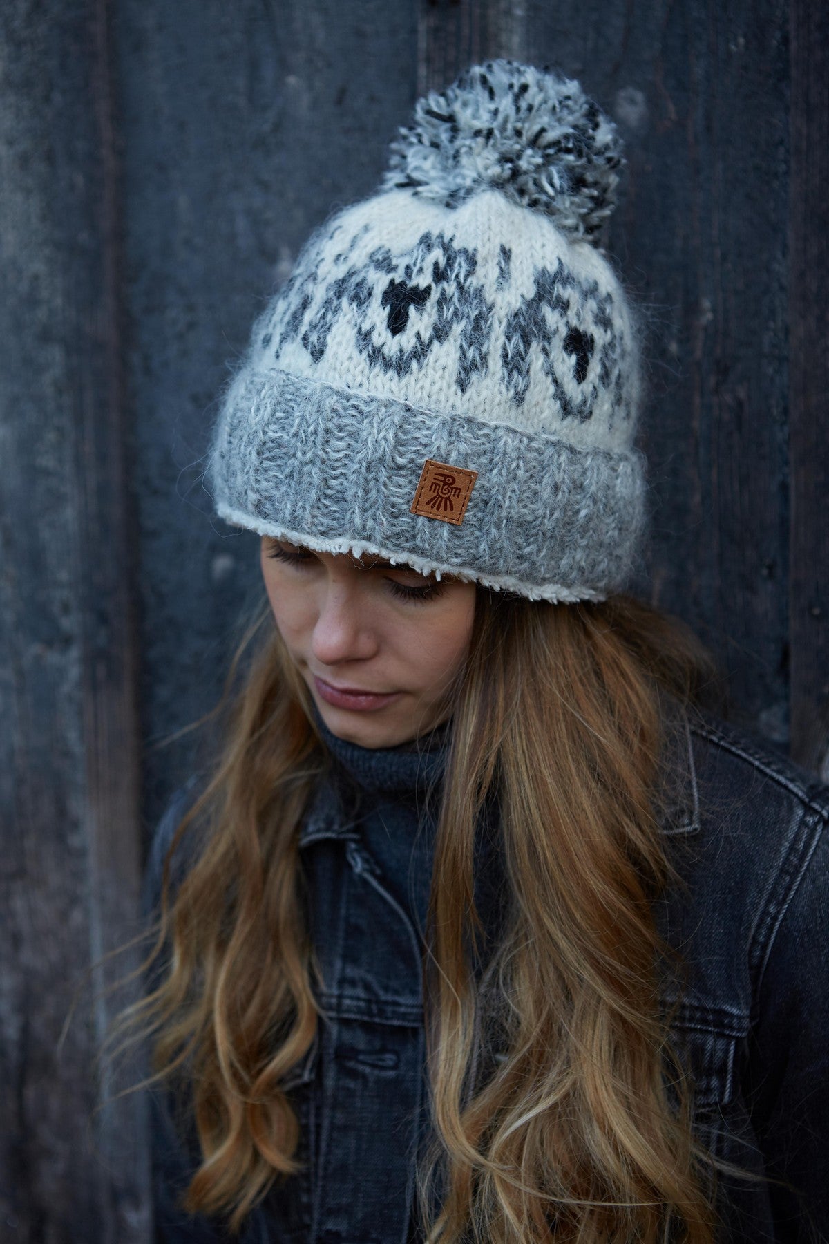 Pachamama Hazy Hound Dog Bobble Beanie, Hand Knitted, Lined, Wool and Mohair Blend