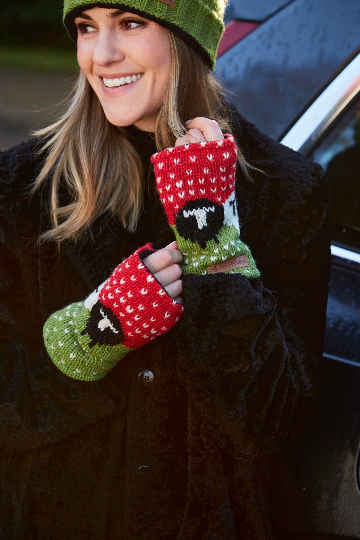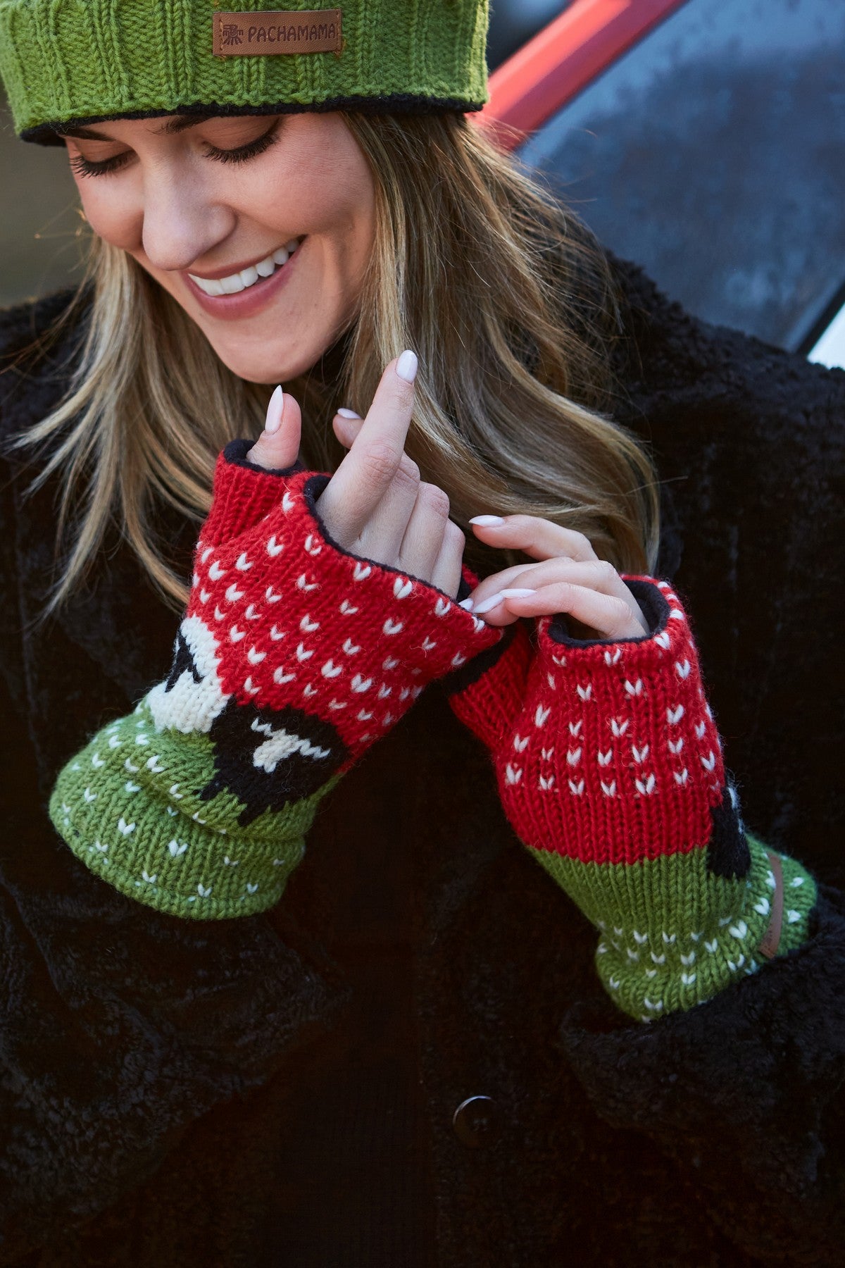 Crafted by hand for both warmth and fashion, these fingerless gloves showcase an enchanting sheep design with a vibrant splash of colour to add a whimsical twist. Women's hand-knitted fingerless handwarmers feature Pachamama's charming farm animal sheep pattern set against a red backdrop.