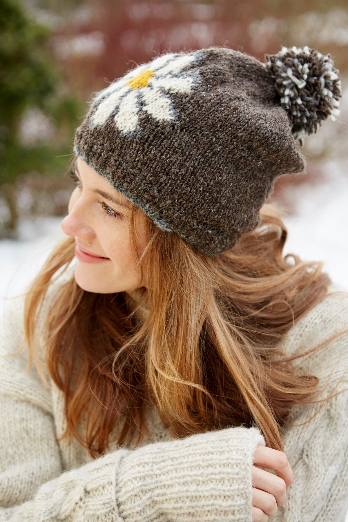 Pachamama Daisy Bobble Beanie, Hand Knitted, Sherpa Fleece Lined, Wool, Bark