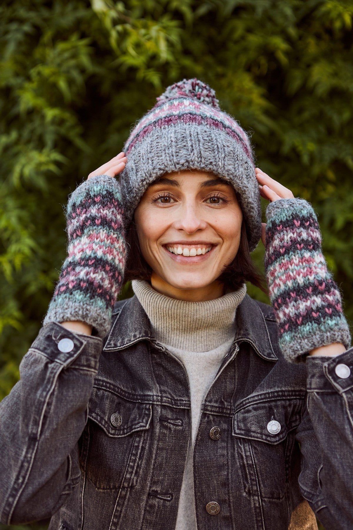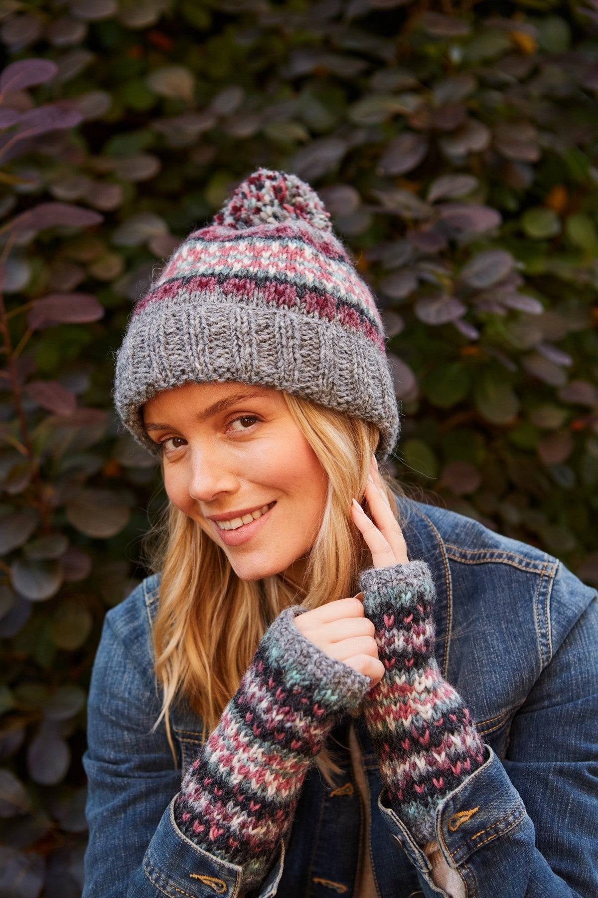 Pachamama Wharfdale Handwarmer, Hand Knitted, Lined, Wool, Fairisle Purple/Grey