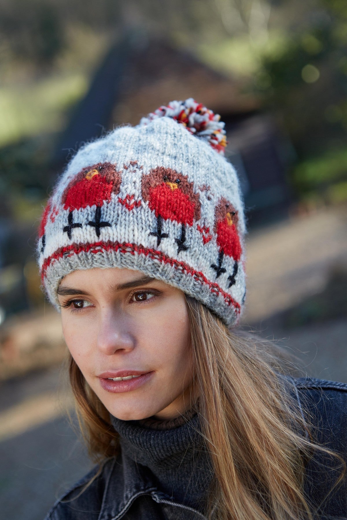 Delicately knitted robins adorned with beads and embroidered beaks set against a light grey backdrop ensure warmth and comfort during a brisk winter stroll. The Pachamama Women's wool bobble hat, featuring charming Red Robin patterns, is fair trade and handcrafted in Nepal.