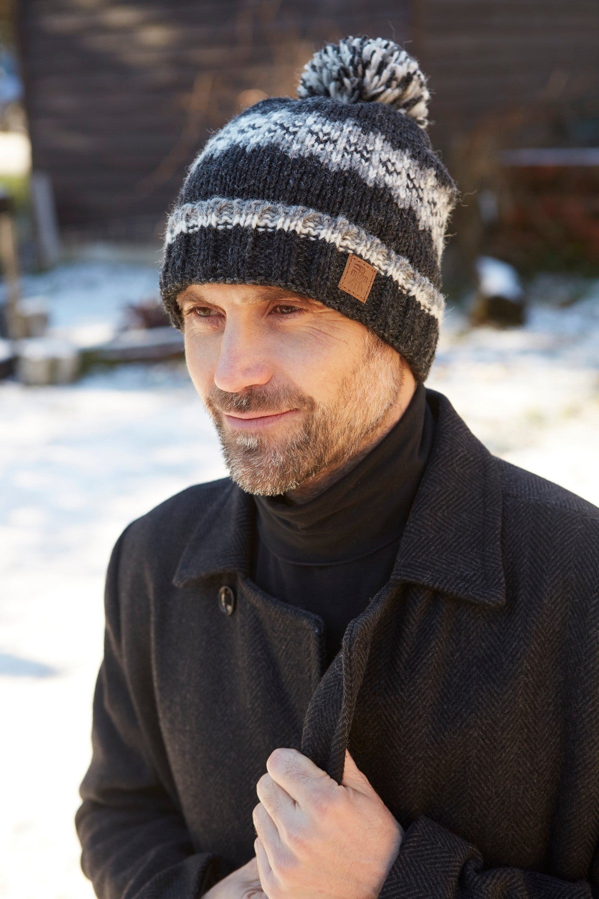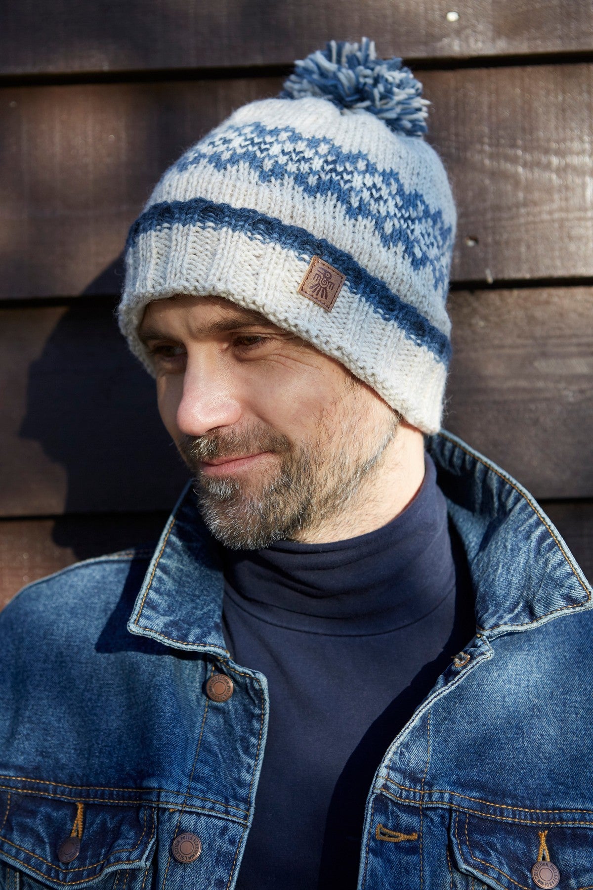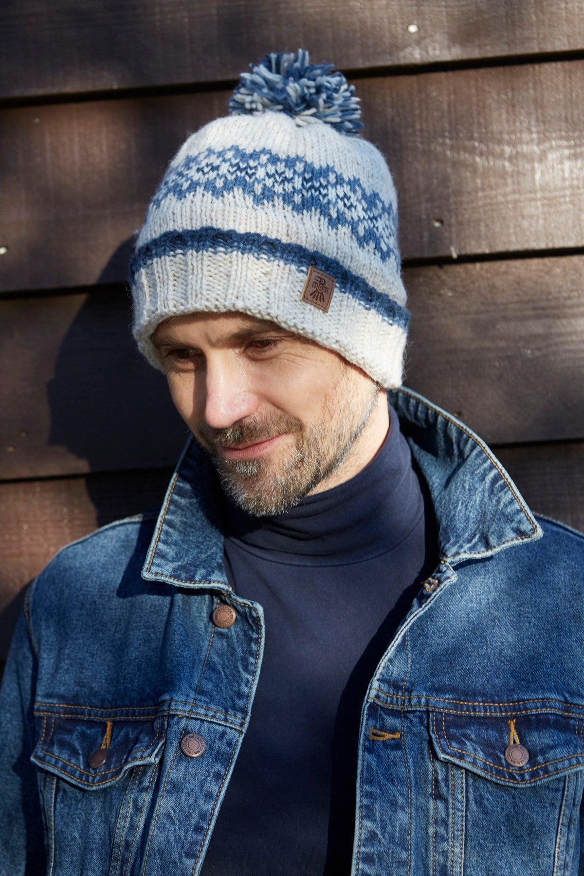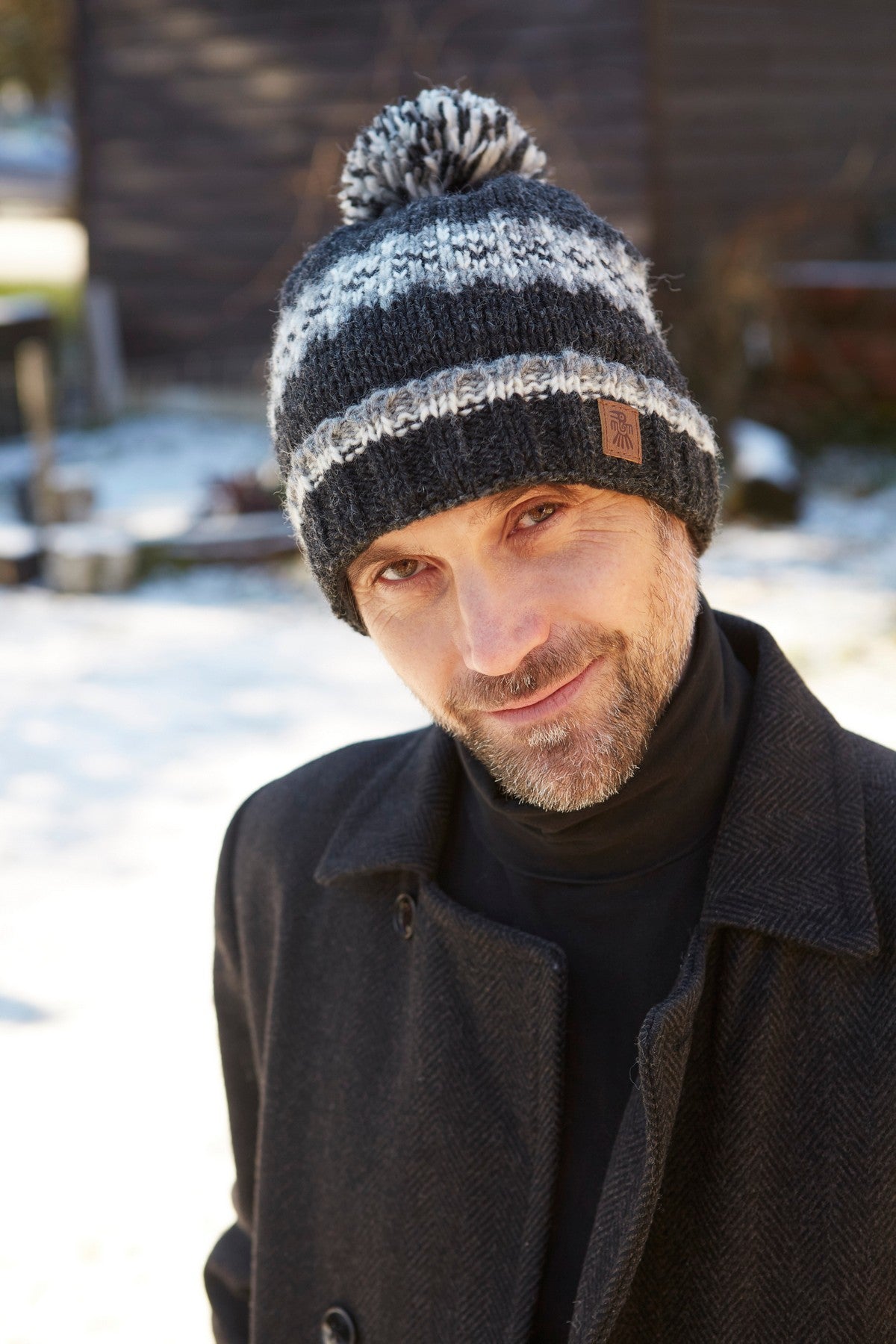 Mens hand knitted wool chunky knit bobble hat, fair trade sourced and handmade in Nepal.