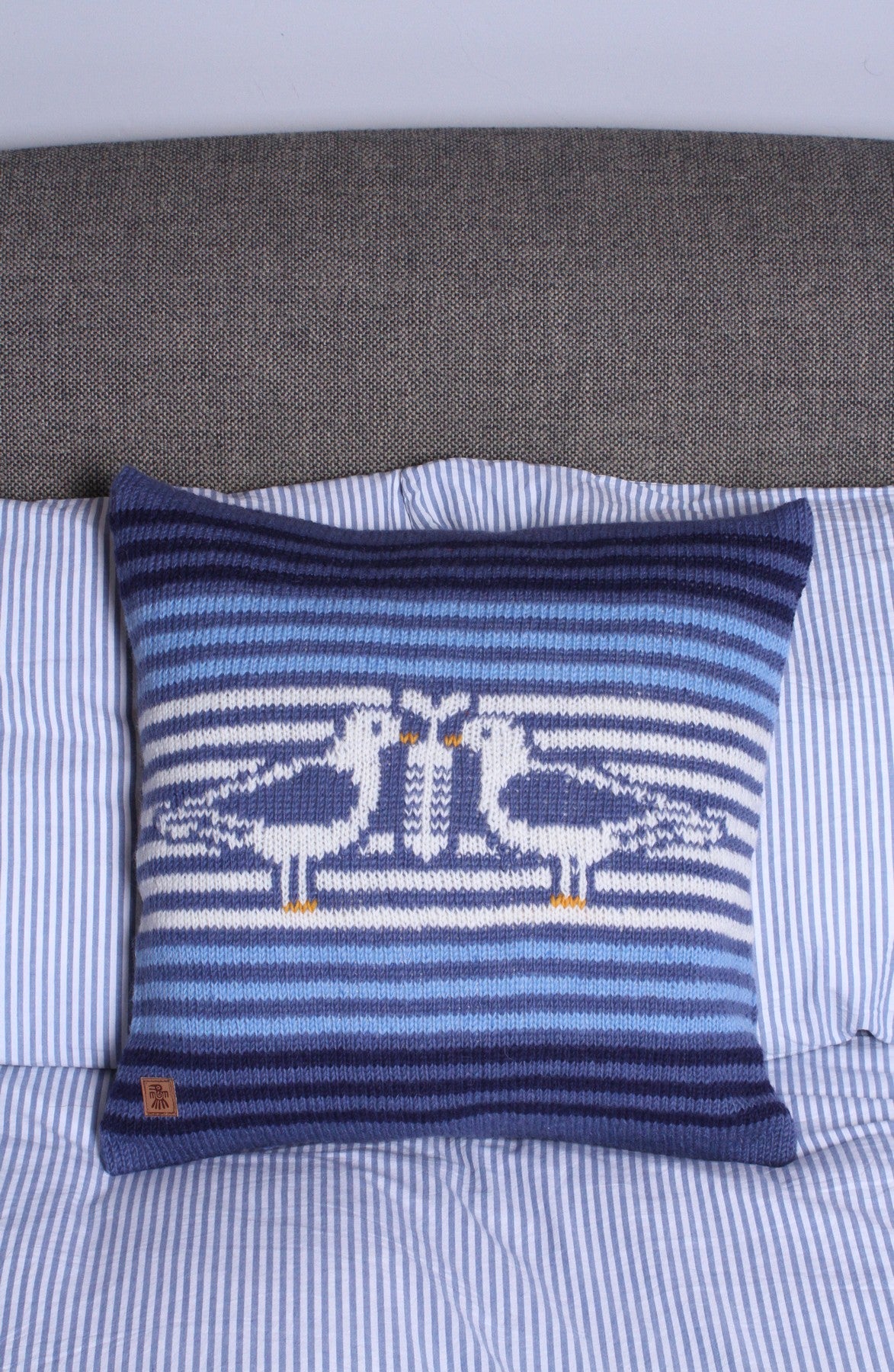 Beautiful hand knitted wool sofa cushion cover, with contemporary seagulls and fish design. Fair trade sourced and hand made in Nepal.