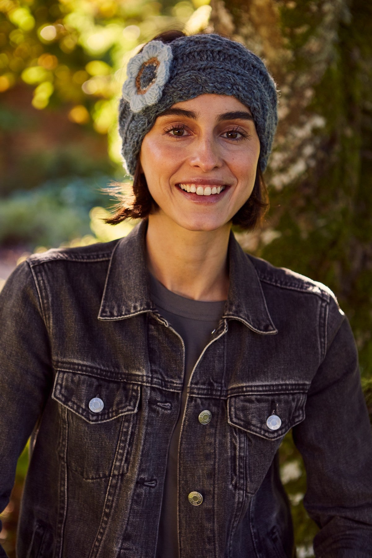 Beautiful cable knit design with featured crochet flower on this headband. Ideal for new outdoor lifestyles and keeping ears warm and toasty.