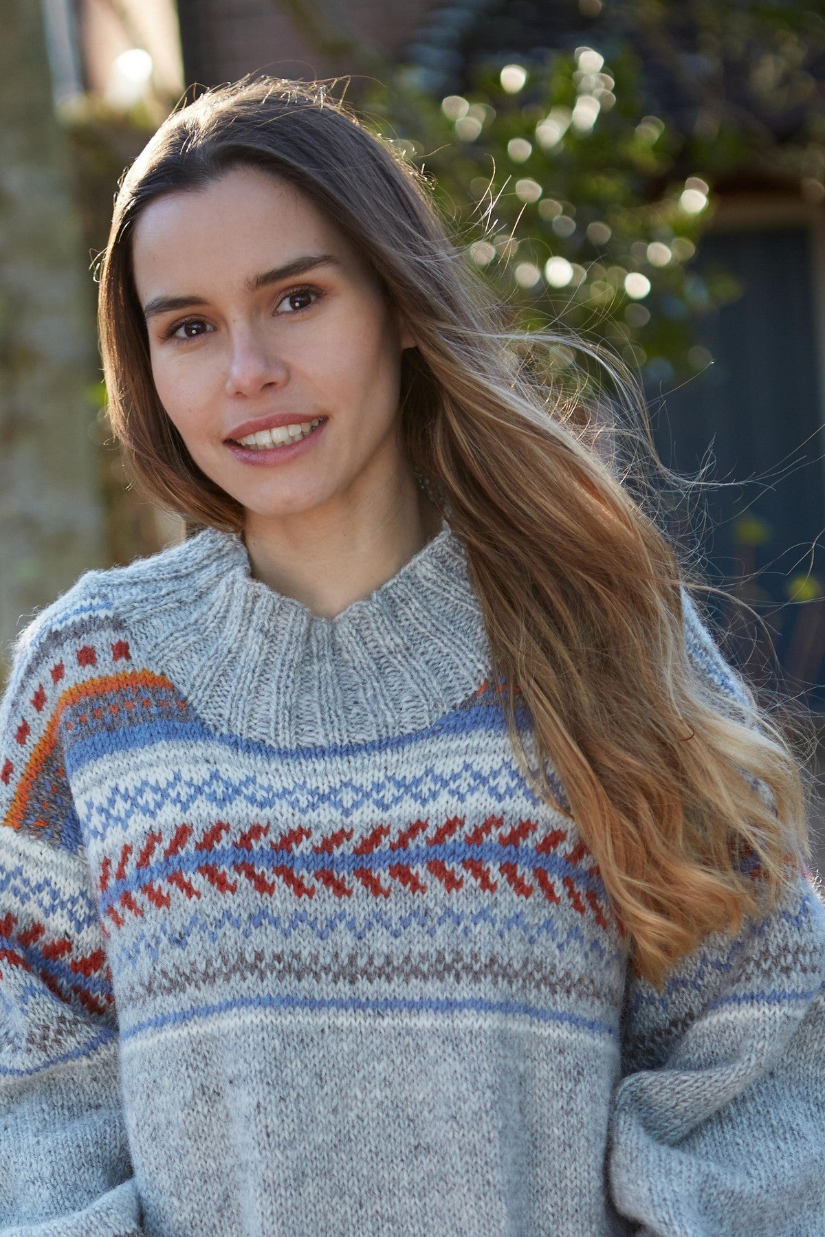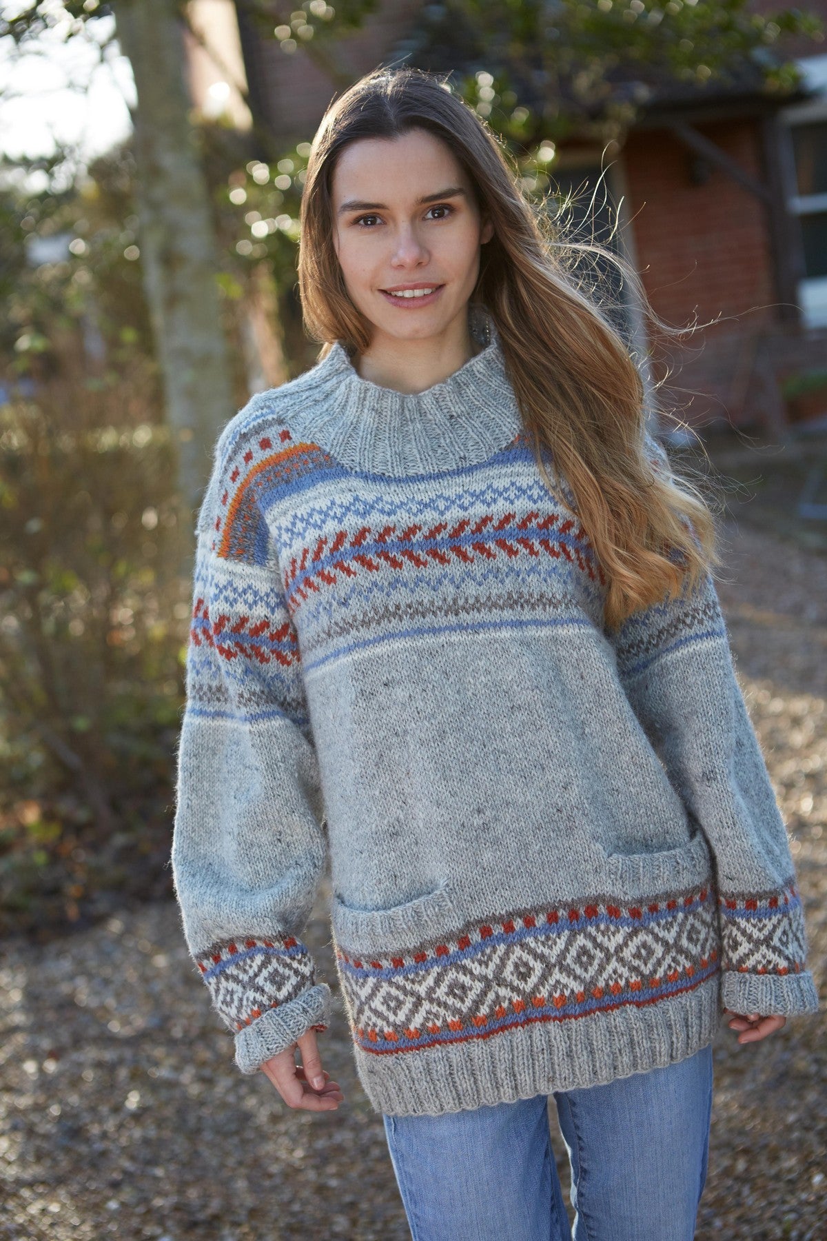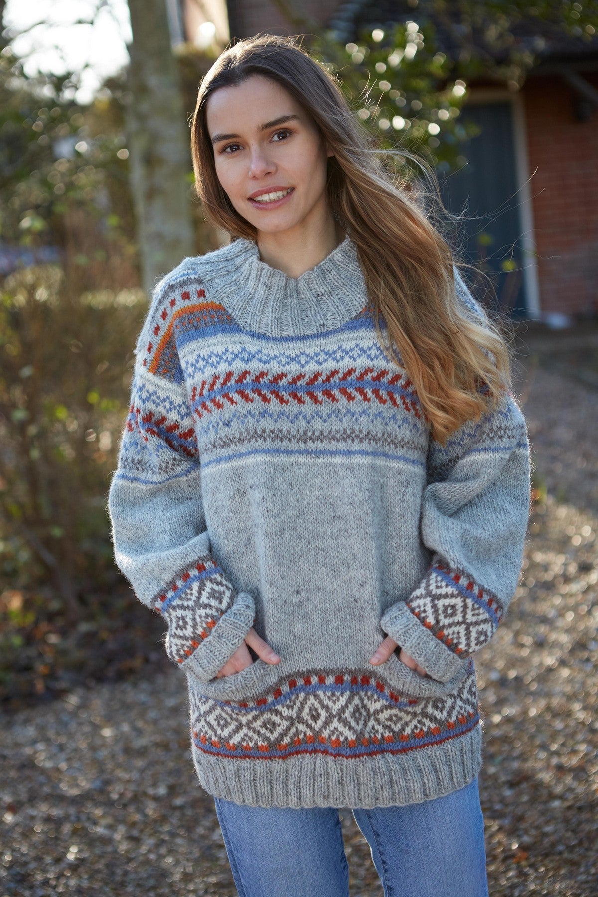 A relaxed oversized fit perfect for staying warm in the cooler weather. Fair Isle design on front, back and sleeves. Hand knitted. This lovely design adds your own touch of special to outdoor living. Added benefit of 2 pockets on front.