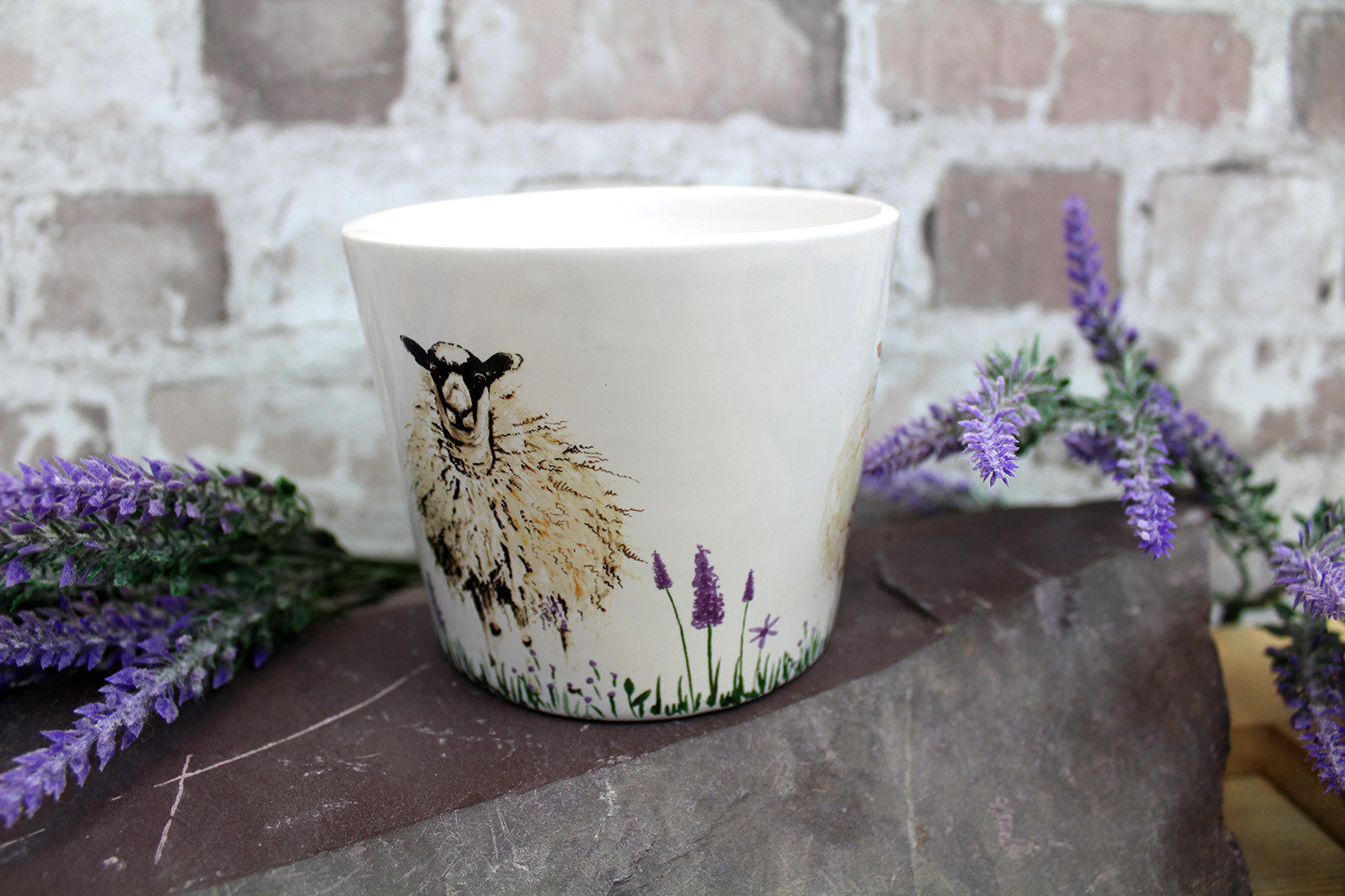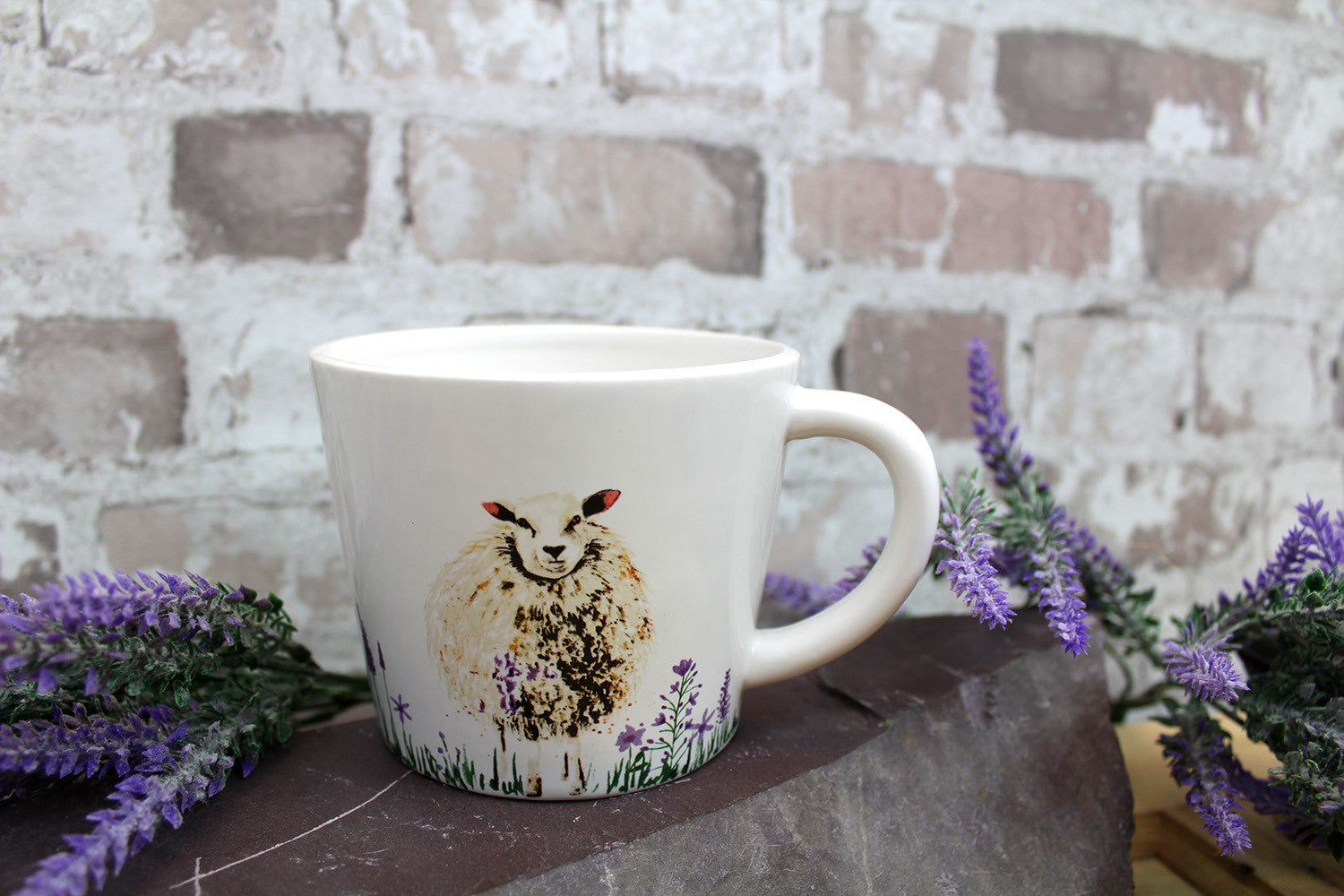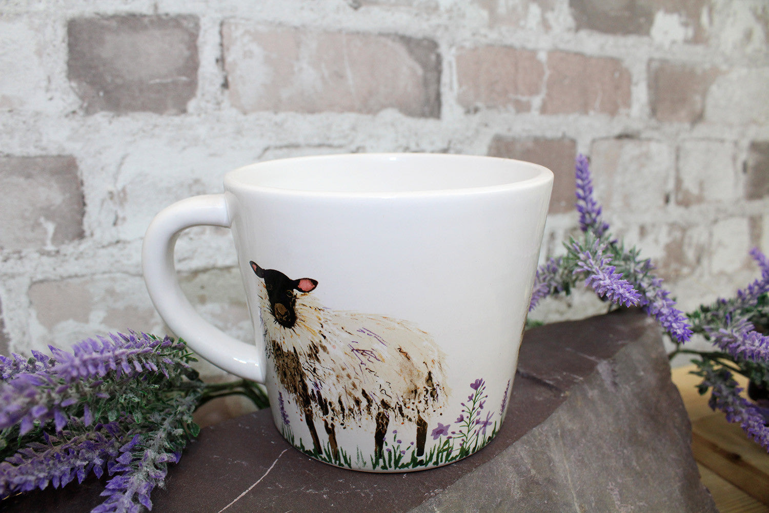 Cute sheep print mug with 3 sheep scene wrapping around the mug. Nice easy drinking style with large handle.