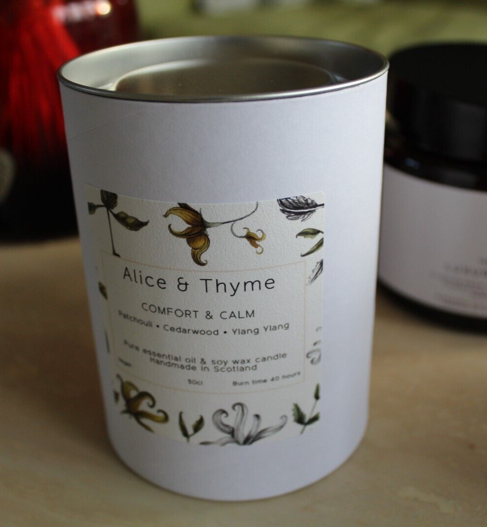 Comfort & Calm candle is a rich and powerful scent. Combining the sweet scents of ylang ylang, and the earthy shades of cedarwood and patchouli. Grounding, calming and stabilizing.